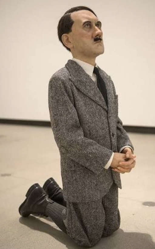 “Him” raffigura Hitler inginocchiato in preghiera, in una postura tradizionalmente associata all’umiltà, al pentimento e alla richiesta di perdono. Il contrasto con l’identità del personaggio rappresentato — il responsabile di uno dei più grandi genocidi della storia — genera un conflitto immediato nello spettatore. L’opera non offre risposte, ma obbliga a porsi domande scomode: può il male chiedere perdono? E soprattutto, siamo disposti a guardarlo in faccia?