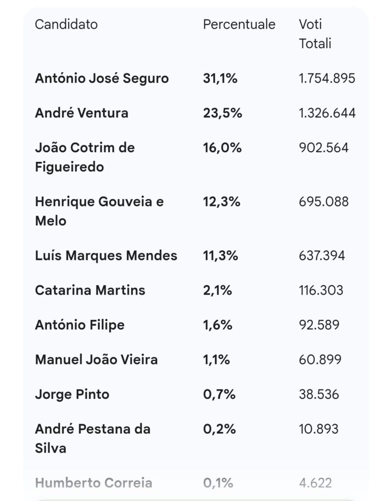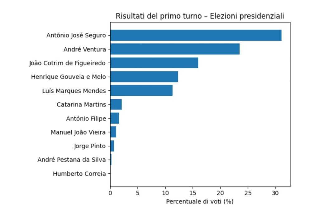António José Seguro ha chiuso il primo turno in testa, confermandosi come il candidato capace di aggregare il voto utile di una parte consistente dell’elettorato di sinistra e di centro. Alle sue spalle si è posizionato André Ventura, che ha consolidato il ruolo del Chega come principale forza della destra radicale e ha ottenuto un risultato sufficiente per accedere al ballottaggio, pur restando a distanza dal primo classificato.